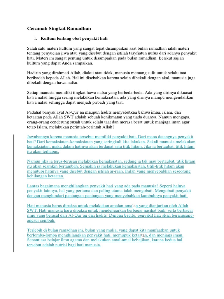 Daftar lengkap contoh materi kultum singkat dan ceramah ramadhan terbaru tahun 2020 m / 1441 h. Situasi pandemi yang belum berakhir meminta kita juga untuk selalu mementingkan kebersihan diri dan lingkungan. 3 obat untuk penyakit hati. Kultum singkat ramadhan terbaru 2019 1440h: Beranda download kajian ustadz abu yahya badrusalam tematik kumpulan materi kultum singkat yang menarik: